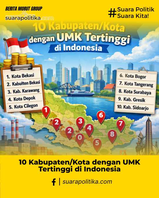 SUARAPOLITIKA.COM- Upah Minimum Kabupaten/Kota (UMK) tahun 2026 menjadi salah satu indikator penting dalam mengukur kesejahteraan pekerja sekaligus daya tarik ekonomi suatu daerah. Menariknya, wilayah-wilayah dengan aktivitas industri dan jasa yang tinggi masih mendominasi daftar UMK tertinggi di Indonesia.