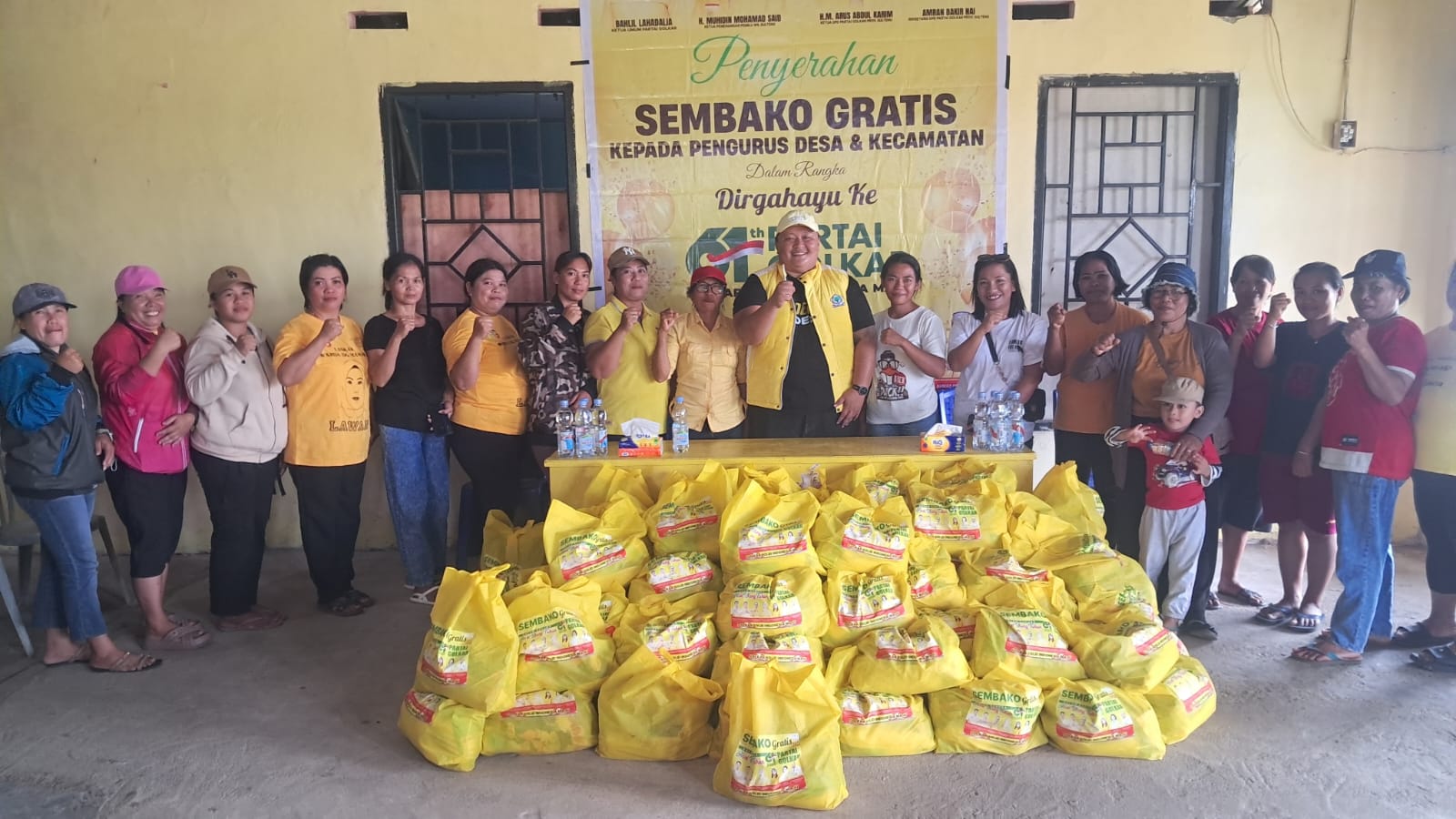 MORUT- Sebanyak 120 paket sembako gratis dibagikan Partai Golkar dalam rangkaian HUT ke-61, di kecamatan Mori Utara kabupaten Morowali Utara (Morut), Sabtu, 15 Nopember 2025.