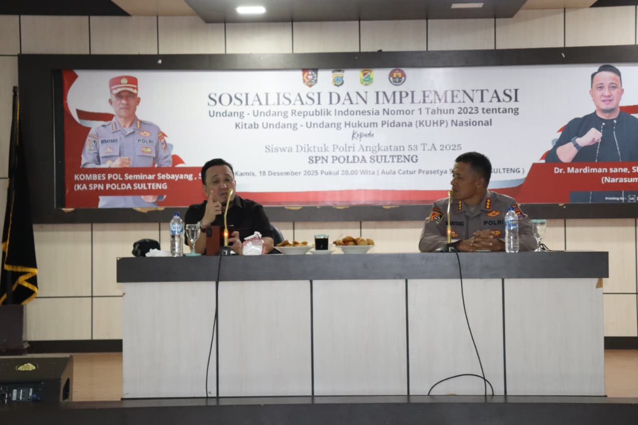 LABUAN – Akademisi dan pakar hukum pidana, Dr. Mardiman Sane, SH., MH, tampil sebagai pemateri dalam kegiatan pengayaan wawasan hukum bagi 72 siswa Pendidikan Pembentukan (Diktuk) POLRI di SPN Polda Sulawesi Tengah, Labuan. Jumat malam, 19 Desember 2025.