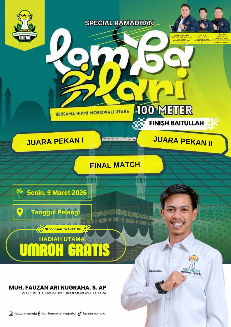 Melalui lomba lari 100 meter yang digelar di kawasan Tanggul Pelangi Kolonodale, para peserta tidak sekadar berkompetisi memacu kecepatan, tetapi juga mengejar hadiah yang sangat istimewa, hadiah khusus yang diberikan oleh sosok muda Muh. Fauzan Ari Nugraha, S. AP atau Fauzan Mamala: perjalanan ibadah ke Tanah Suci.