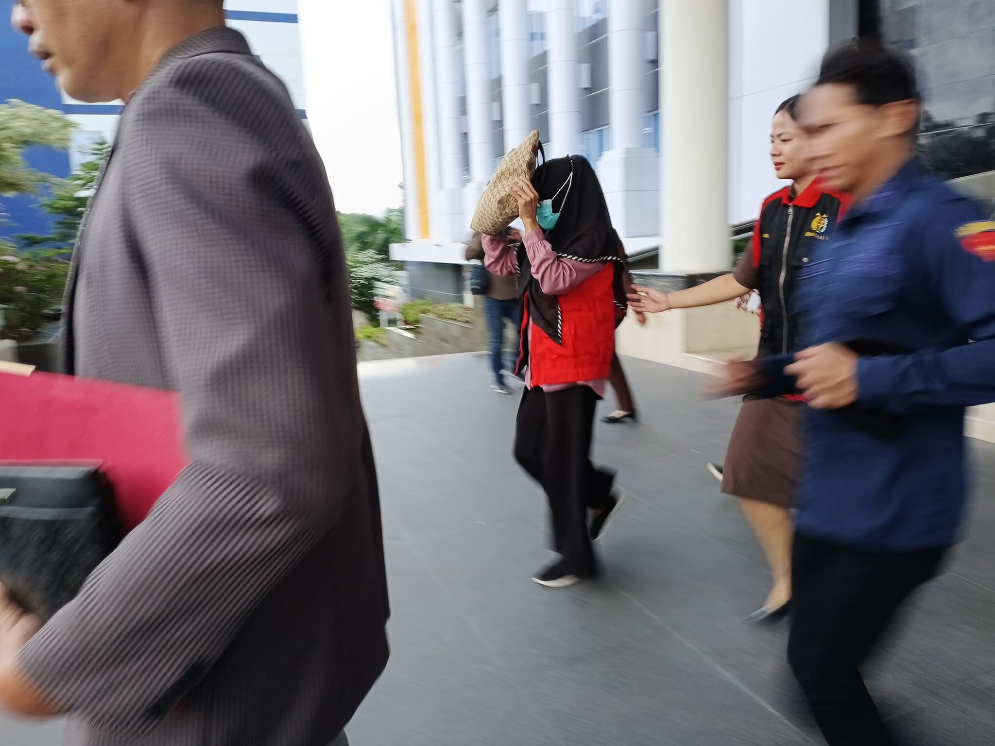 Ketiga tersangka yang ditahan, salah satunya mantan Ketua Gabungan Pelaksana Konstruksi Nasional Indonesia (Gapensi) Sulteng, inisial IS. Ia bergegas memasuki mobil tahanan saat digiring jaksa.