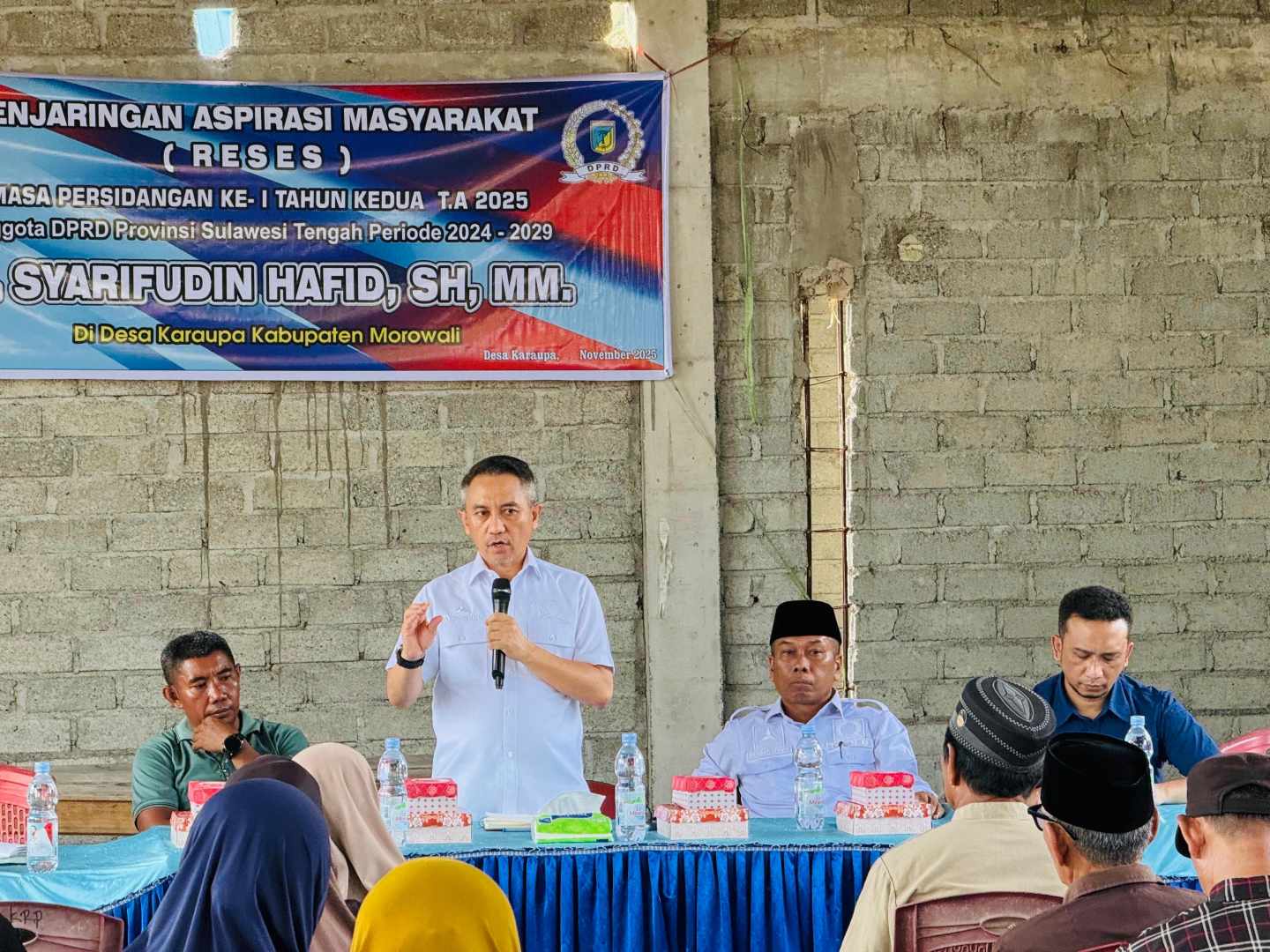 MOROWALI – Wakil Ketua (Waket) II DPRD Provinsi Sulawesi Tengah, H. Syarifudin Hafid, SH., MM., melaksanakan Reses Masa Persidangan I Tahun II Anggaran 2025 di Desa Karaupa, Kabupaten Morowali, Senin (17/11).